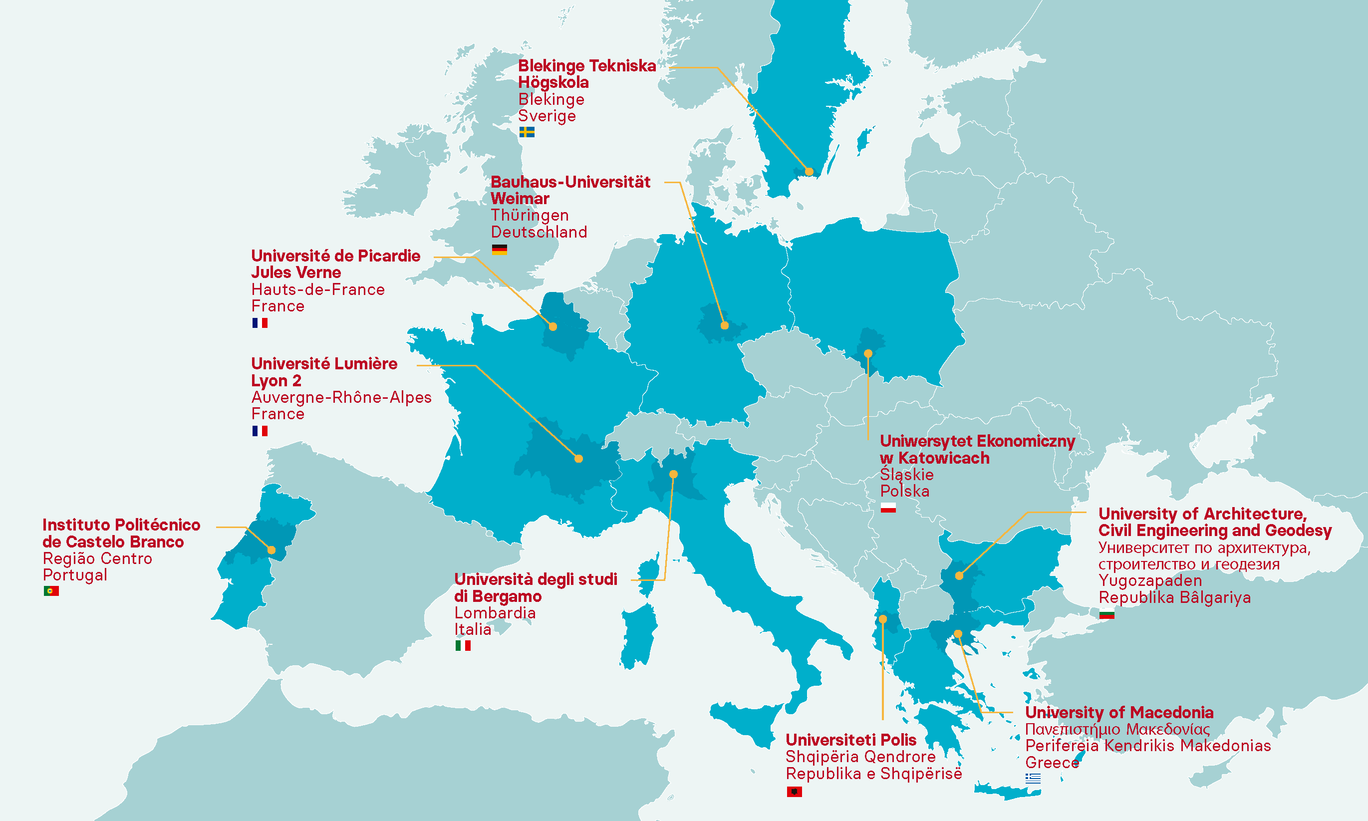 L'Alliance BAUHAUS4EU est constituée de 10 partenaires européens ou faisant partie de l'Union Européenne, dont l'Université Lumière Lyon 2 :