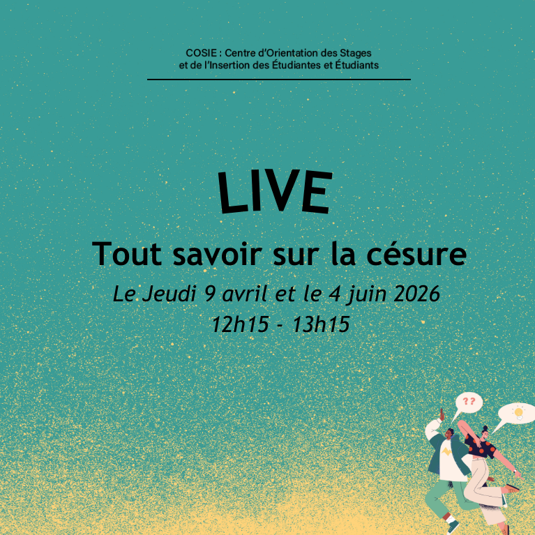 | Live ouvert à toutes les étudiantes et tous les étudiants. Ce live est proposée par le Centre d'Orientation, des Stages et de l'Insertion des Étudiantes et Étudiants (COSIE). De nombreux modules et lives sont proposés tout au long de l’année pour vous aider, vous conseiller et vous accompagner dans votre vie étudiante. Découvrez le programme complet. |