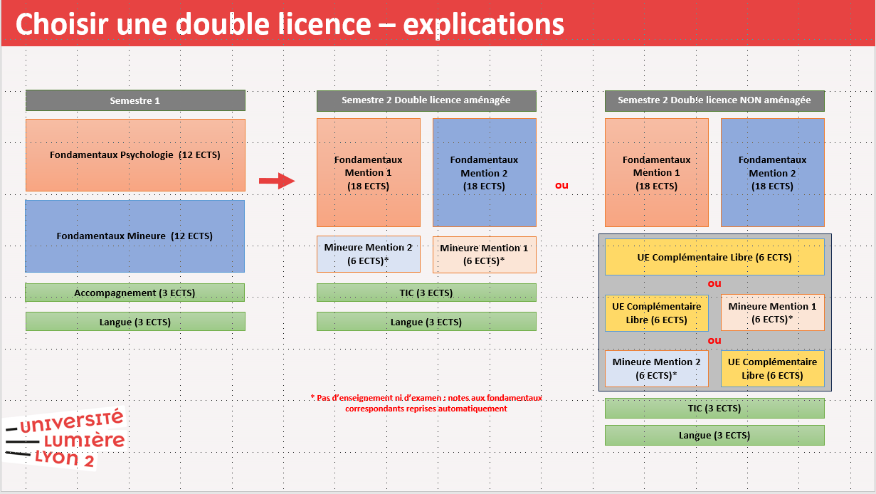 À l'Université Lumière Lyon 2, vous pouvez choisir entre deux régimes de double licence : aménagée ou non aménagée. Voir le schéma simplifié.
