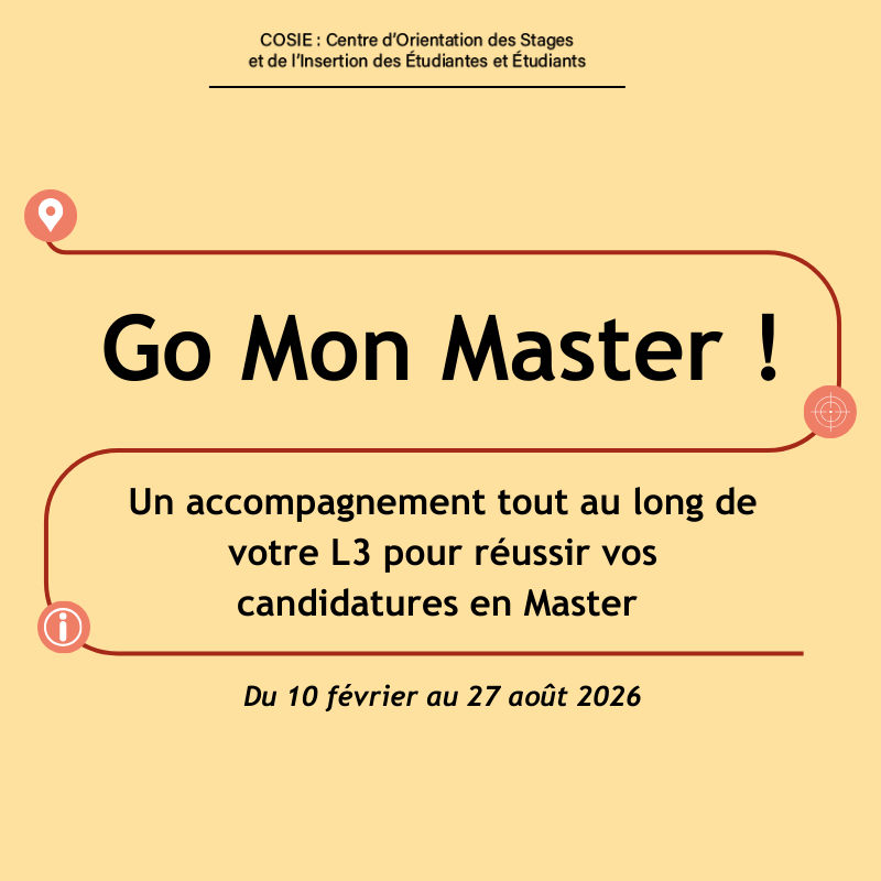 Go MonMaster est un dispositif d’accompagnement du Centre d’Orientation, des Stages et de l’Insertion des Étudiantes et Étudiants (COSIE). Il accompagne les étudiantes et étudiants tout au long de l’année universitaire pour :