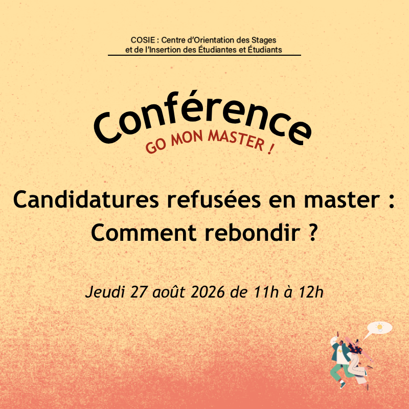 | Ces conférences sont proposées par le Centre d'Orientation, des Stages et de l'Insertion des Étudiantes et Étudiants (COSIE). De nombreux modules et conférences sont proposées tout au long de l’année pour vous aider, vous conseiller et vous accompagner dans votre vie étudiante. Découvrez le programme complet. |