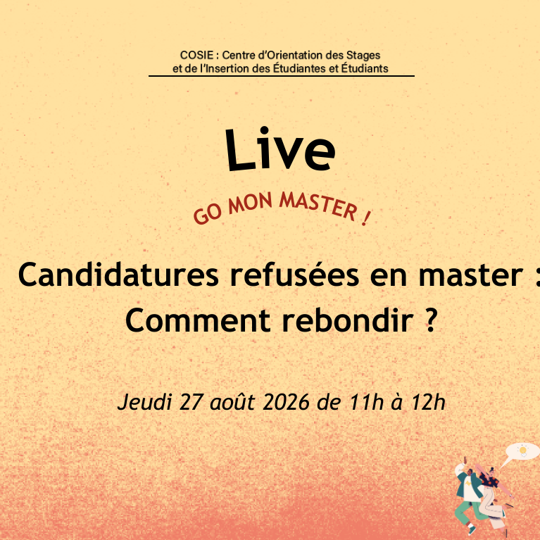 Recevoir un refus en master peut être difficile à vivre. Ce live vise à vous donner des repères et des perspectives concrètes en cas de refus. Nous parlerons des dispositifs existants, notamment la saisine auprès du rectorat et la phase complémentaire ainsi que les possibilités d'orientation et d'insertion professionnelle.