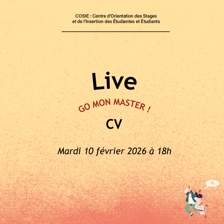 | Ces lives sont proposés par le Centre d'Orientation, des Stages et de l'Insertion des Étudiantes et Étudiants (COSIE). De nombreux modules et lives sont proposés tout au long de l’année pour vous aider, vous conseiller et vous accompagner dans votre vie étudiante. Découvrez le programme complet. |