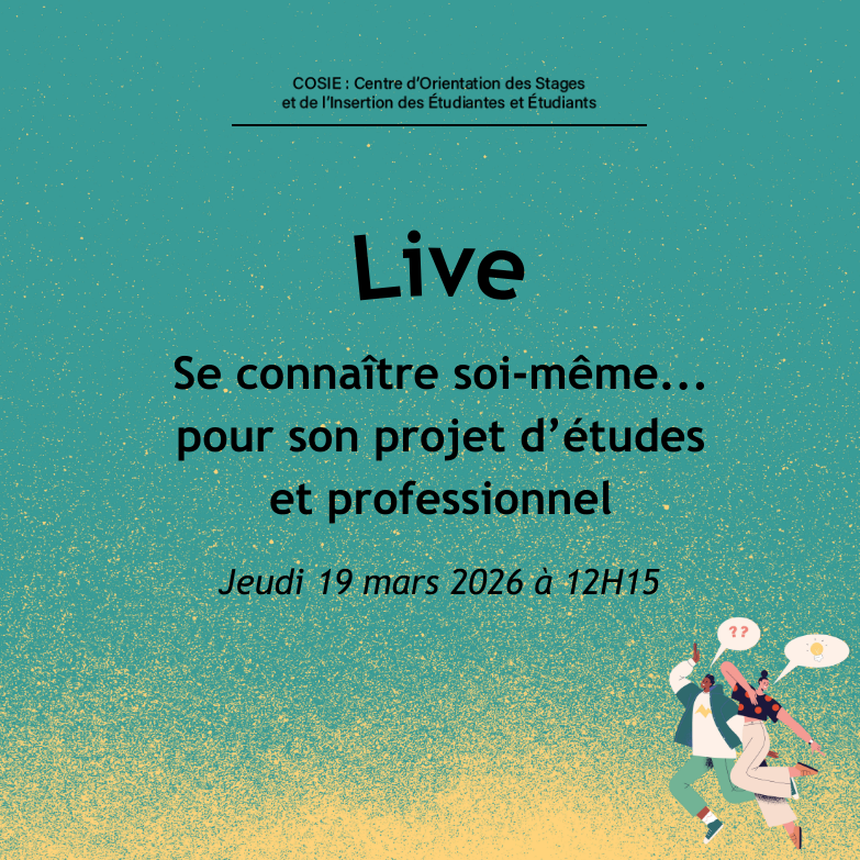 | Ces lives sont proposés par le Centre d'Orientation, des Stages et de l'Insertion des Étudiantes et Étudiants (COSIE). De nombreux modules et lives sont proposés tout au long de l’année pour vous aider, vous conseiller et vous accompagner dans votre vie étudiante. Découvrez le programme complet. |