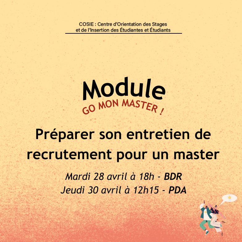 | Ces modules est réservés aux étudiantes et étudiants de L3. Ces modules sont proposés par le Centre d'Orientation, des Stages et de l'Insertion des Étudiantes et Étudiants (COSIE). De nombreux modules et lives sont proposés tout au long de l’année pour vous aider, vous conseiller et vous accompagner dans votre vie étudiante. Découvrez le programme complet. |