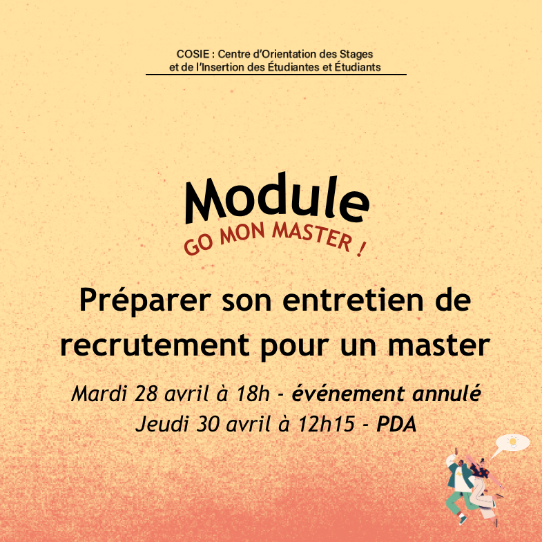 Attention : Deux événements sur la même thématique sont proposés sur les mêmes créneaux, l'une d'entre elles est centré sur les candidatures MonMaster. Pensez à vérifier les informations en amont.