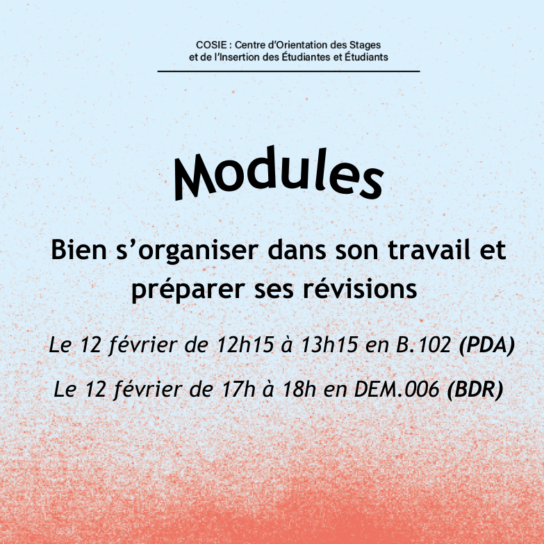 Participez à ce module pour comprendre en quoi consiste le travail personnel à l’université, obtenir des outils concrets pour mieux l’organiser, apprendre à structurer votre planning, partager des astuces pratiques avec d'autres étudiantes et étudiants, et concilier plus sereinement vie personnelle et études.