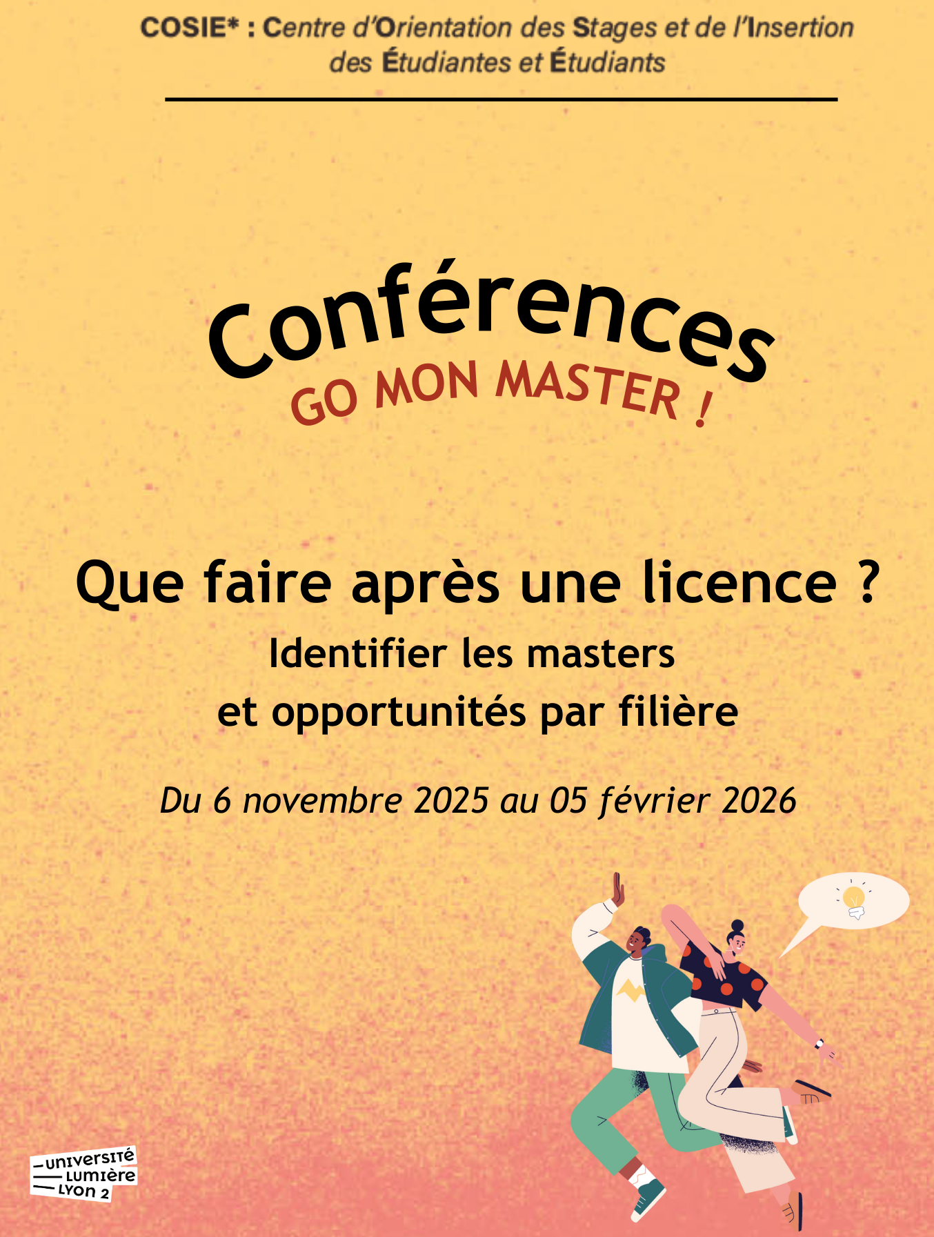 Que faire après votre licence ? Quels sont les masters possibles à l'Université Lumière 2 et ailleurs ? Quelles alternatives s'offrent à vous après la licence (autres formations, insertion professionnelle, concours de la fonction publique…) ? Assistez aux conférences liées à votre domaine d'études.