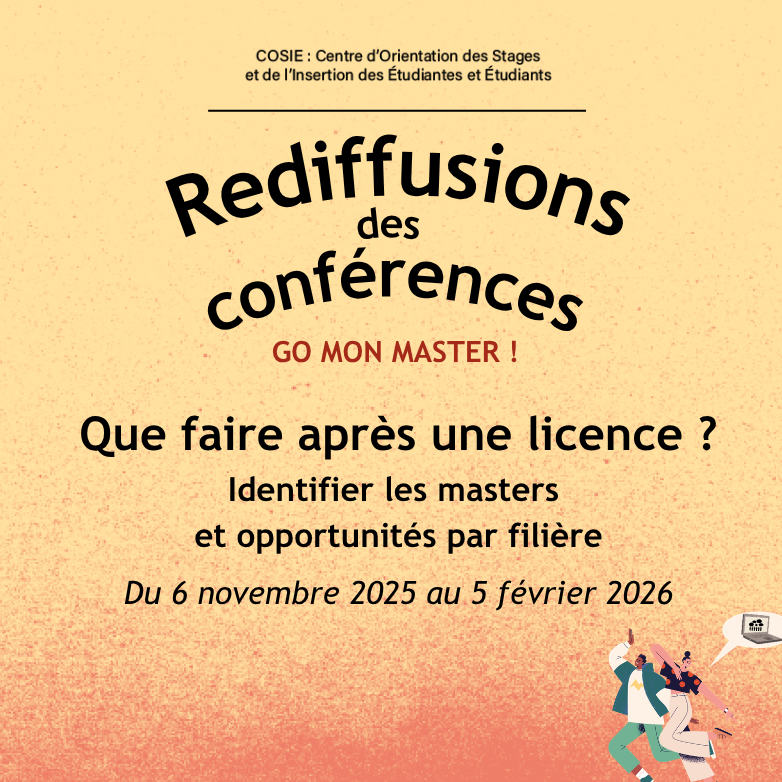 Ces replays de visioconférences vous fournissent des informations sur les perspectives après votre licence, en explorant non seulement différentes formations, mais aussi les opportunités professionnelles et des idées pour votre avenir.Visionner les rediffusions des visioconférences "Que faire après une licence de..." liées à votre domaine d'études organisées par le Centre d'Orientation, des Stages et de l'Insertion des Étudiantes et Étudiants (COSIE).