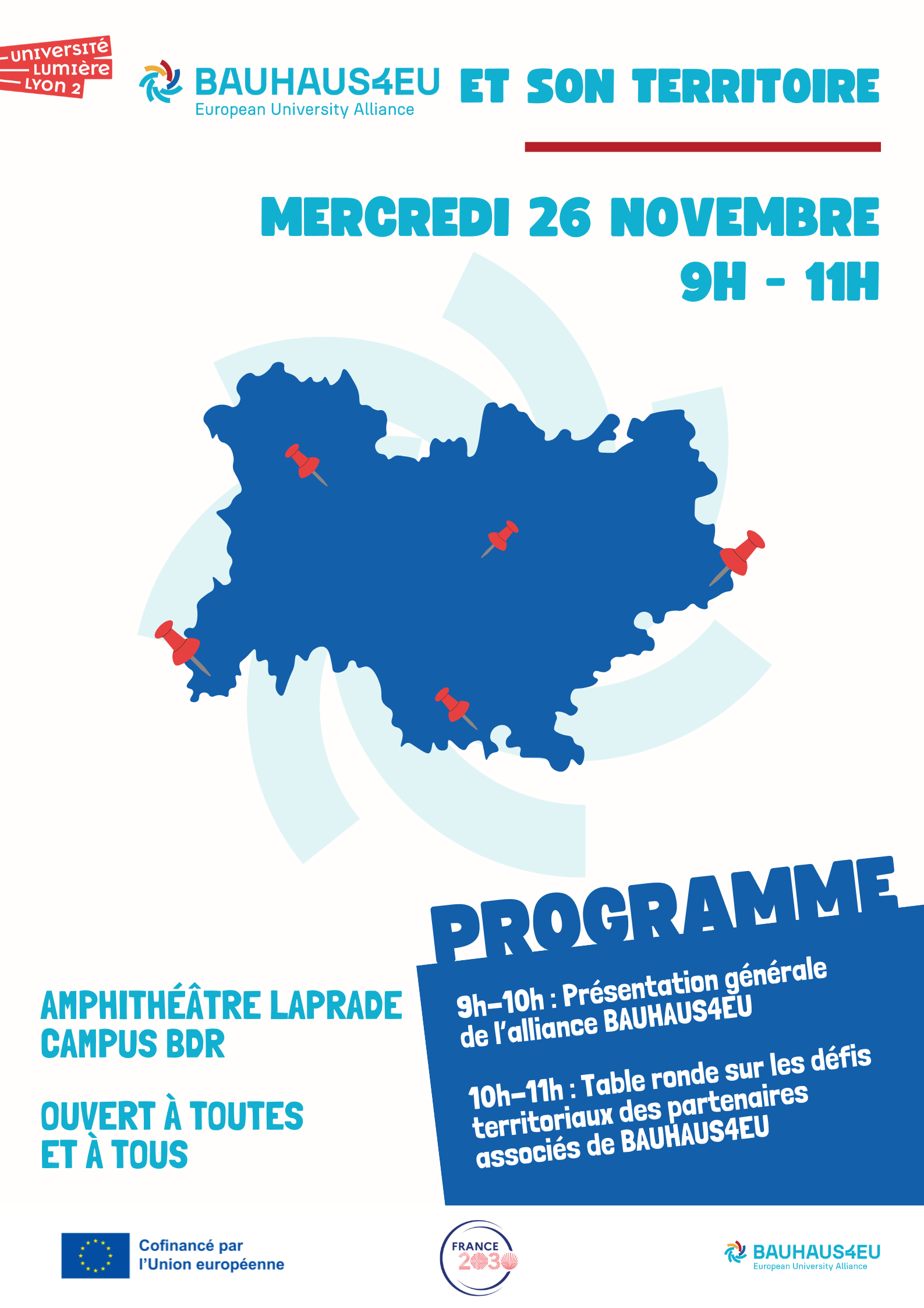 Le mercredi 26 novembre, toute la communauté universitaire est invitée à une conférence de présentation générale de l’Alliance BAUHAUS4EU, dont l’Université Lumière Lyon 2 est membre. Étudiantes et étudiants, personnel académique et administratif, venez découvrir les volets de travail et appels à projets en cours ou à venir !