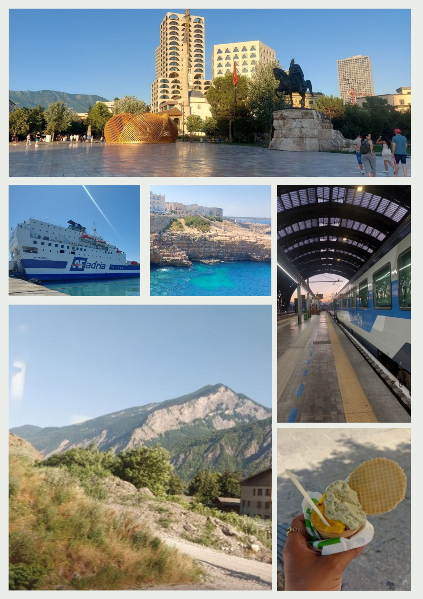 | Itinéraire du voyage jusqu'à Tirana (Albanie). Aller/retour en sens inverse : Jour 1 : Train de Lyon à Chambéry, puis de Chambéry à Milan (5h30) Jour 2 : Train de Milan à Bari (9h45) et Ferry de nuit de Bari à Durres (10h) Jour 3 : Bus de Durres à Tirana (35 minutes) |