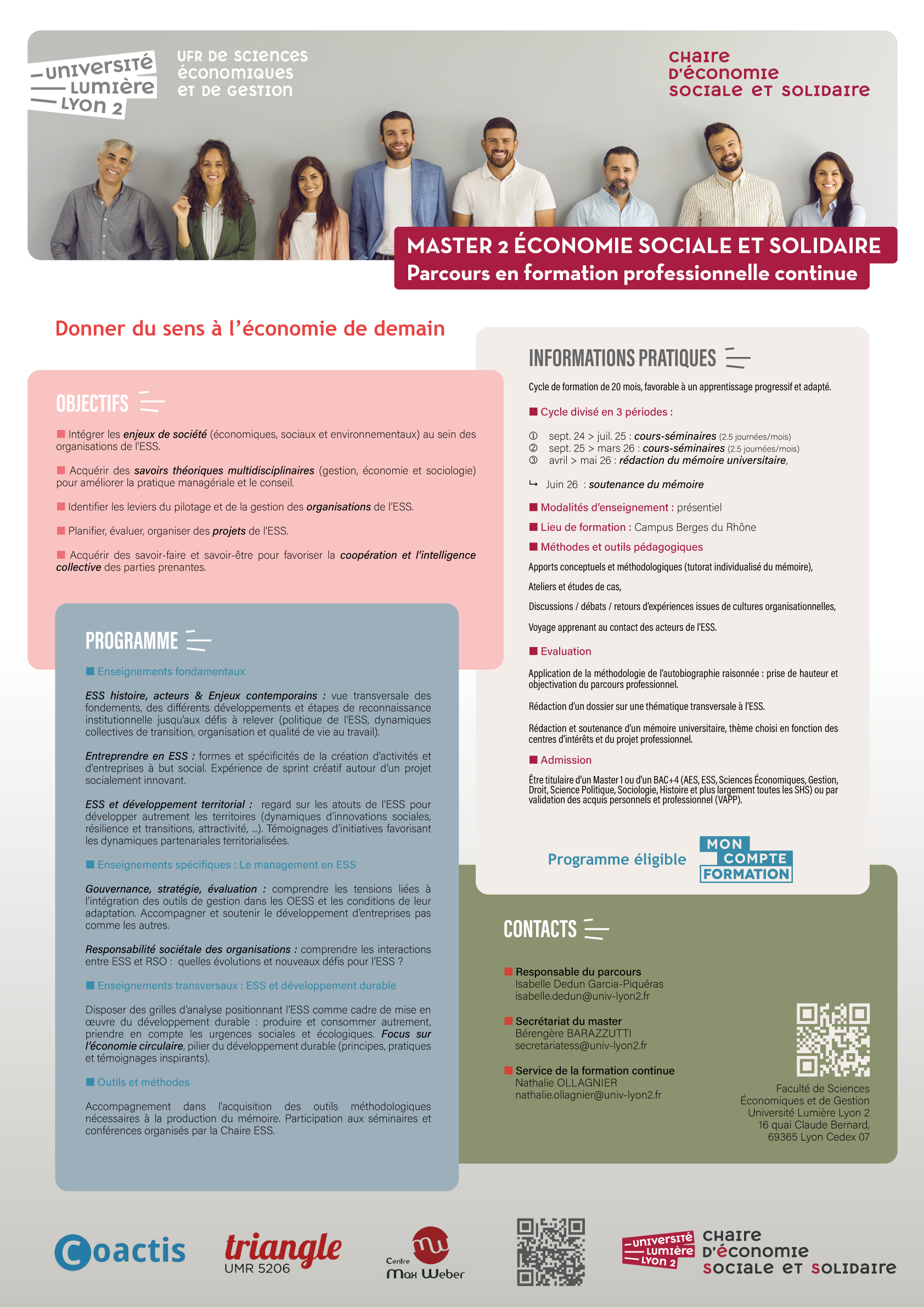 vision transversale du champ de l'ESS. Il ne se focalise donc pas sur une spécialité (insertion par l'emploi, vie associative, développement local, gestion sanitaire et sociale, développement urbain, action humanitaire, développement durable, etc.). La formation s'organise autour d'enseignements fondamentaux, spécifiques et transversaux. Ils sont complétés par un module Outils et méthodes qui inclue des conférences et séminaires en appui à la réalisation du mémoire.