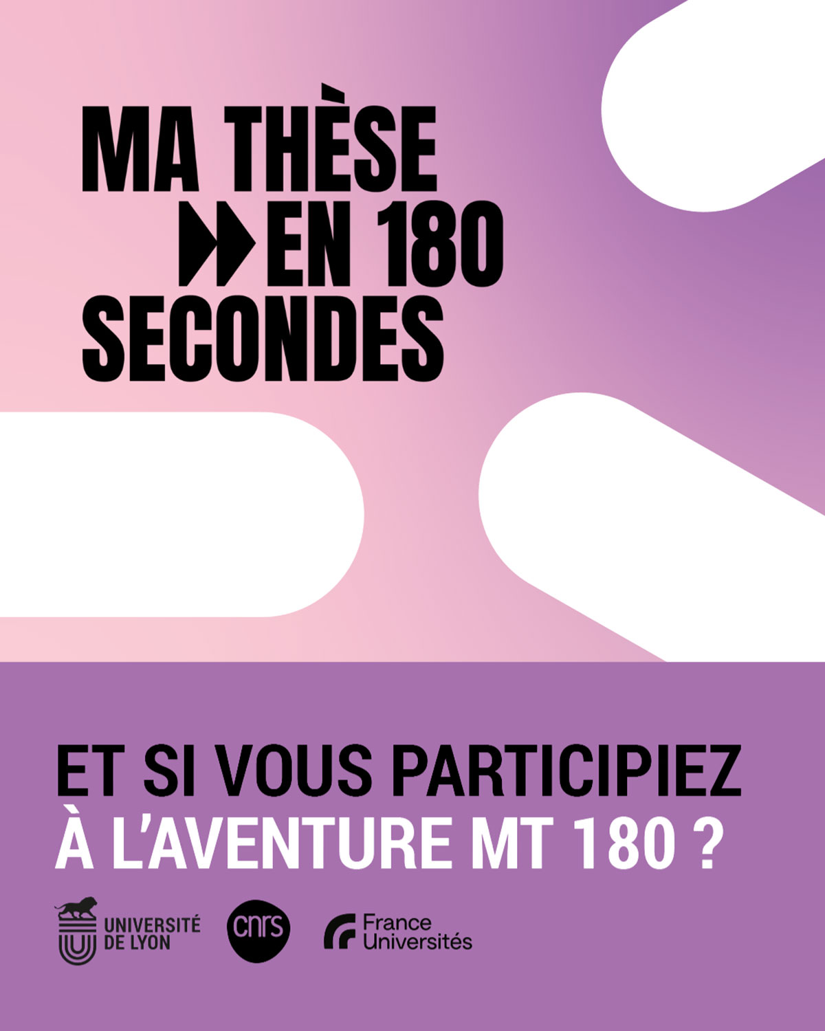 2 - Envoyer une vidéo de 3 minutes de votre sujet de thèse vulgarisé, accompagnée de l'autorisation de votre directeur ou directrice de thèse et/ou financeur à mt180s@universite-lyon.fr via un lien de téléchargement wetranfer avant le 19 février 2026.