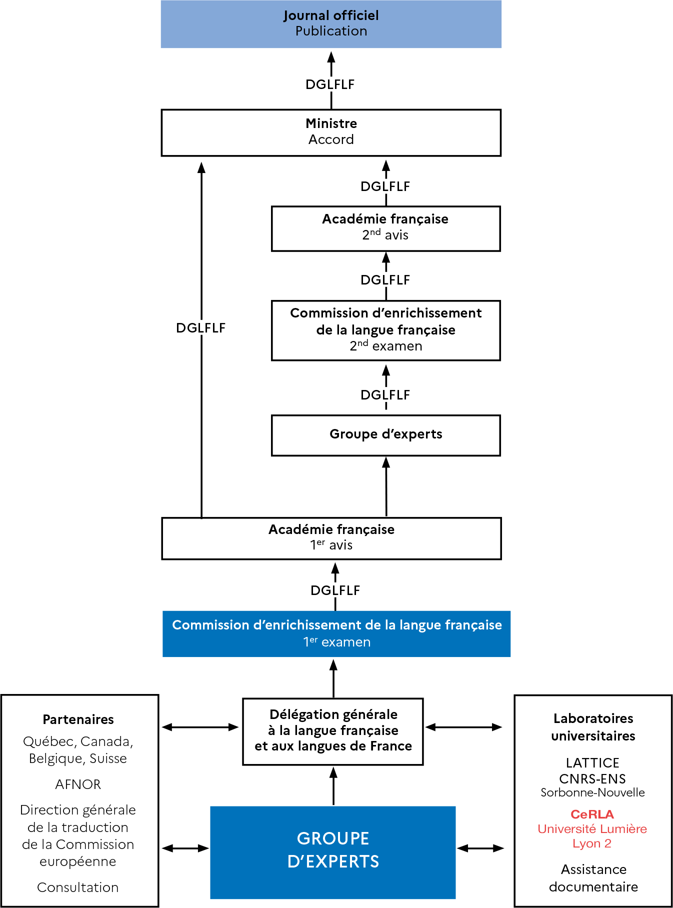 [source : rapport annuel d'activité en 2024 de la Commission d'enrichissement de la langue française - voir le schéma de la procédure, extrait du rapport] |
