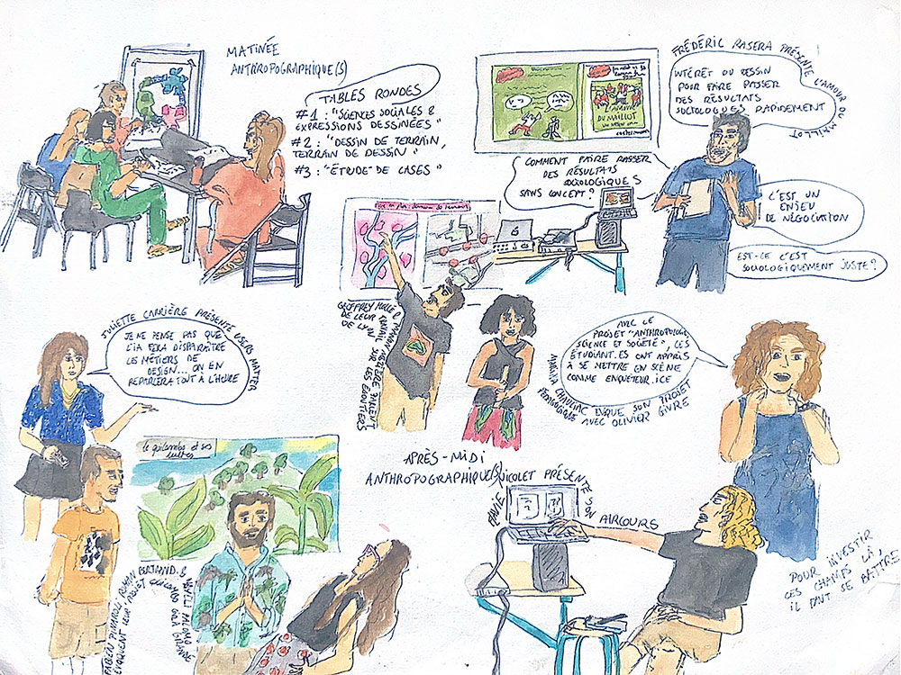 | Trois tables-rondes ont structuré cette journée : ♦ « Sciences sociales et expressions dessinées : décentrements, co-apprentissages, médiations » ; ♦ « Dessin de terrain, terrain de dessin : circulation et hybridation des pratiques » ♦ « Étude de cases : éditorialiser et diffuser les recherches en BD, exemples et perspectives » Chacune a permis de croiser des regards, mettre en miroir des pratiques et questionner les enjeux méthodologiques, narratifs et épistémologiques de ces formes dessinées. L’objectif était aussi d’approfondir les questionnements soulevés lors des ateliers, à partir d’autres points de vue et expériences. |