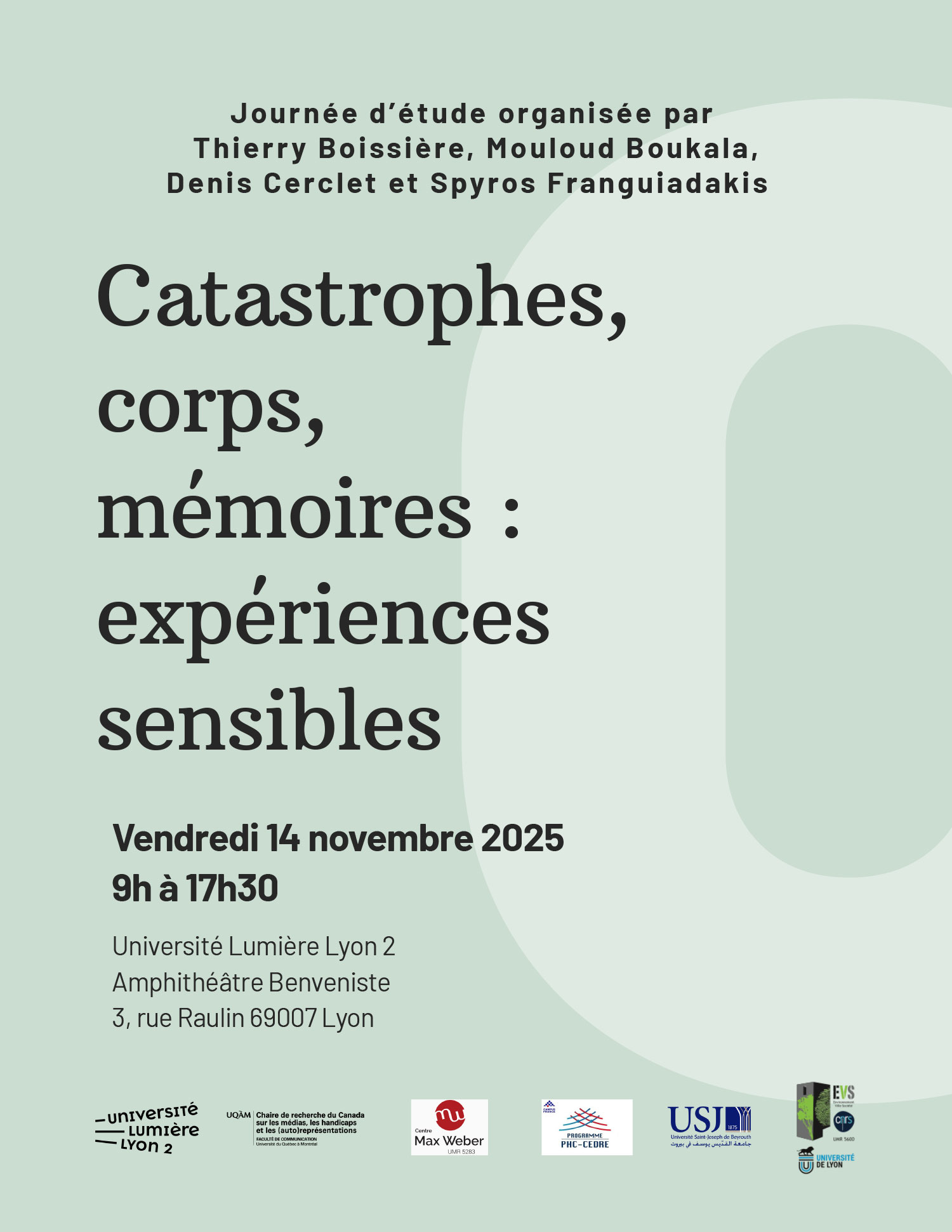 Journée d’étude organisée par Thierry Boissière, Mouloud Boukala, Denis Cerclet et Spyros Franguiadakis, dans le cadre du programme de recherche "Approche sensible des catastrophes : Corps, Espaces, Mémoires et Explosions (ACEME)", soutenu par la procédure d’appel à projets pluridisciplinaire interne (APPI) de l’Université Lumière Lyon 2