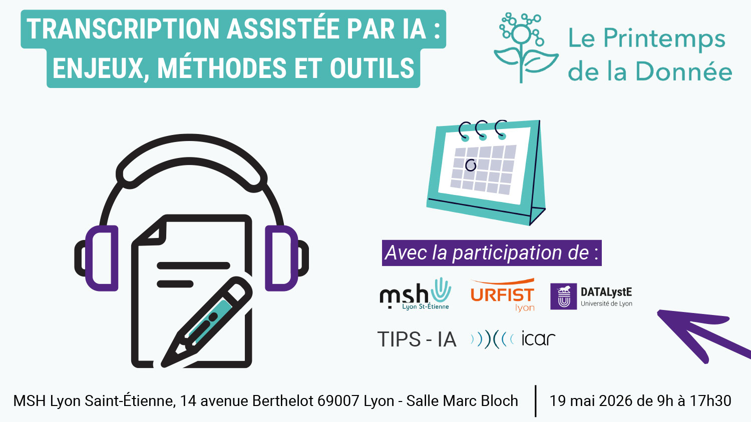 Le groupe TIPS-IA, l'Atelier de la donnée de l'Université de Lyon, DATALystE, ainsi que l'URFIST ont le plaisir de vous inviter à une journée d’étude consacrée à la transcription assistée par intelligence artificielle.