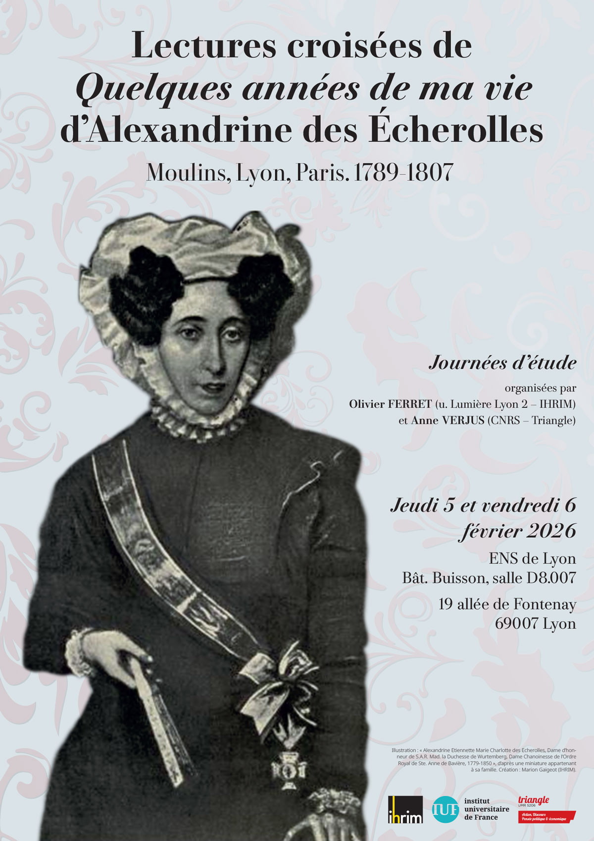 « Alexandrine Etiennette Marie Charlotte des Echerolles, Dame d’honneur de S.A.R. Mad. la Duchesse de Wurtemberg, Dame Chanoinesse de l’Ordre Royal de Ste. Anne de Bavière, 1779-1850 », d’après une miniature appartenant à sa famille. Création : Marion Gaigeot (IHRIM)