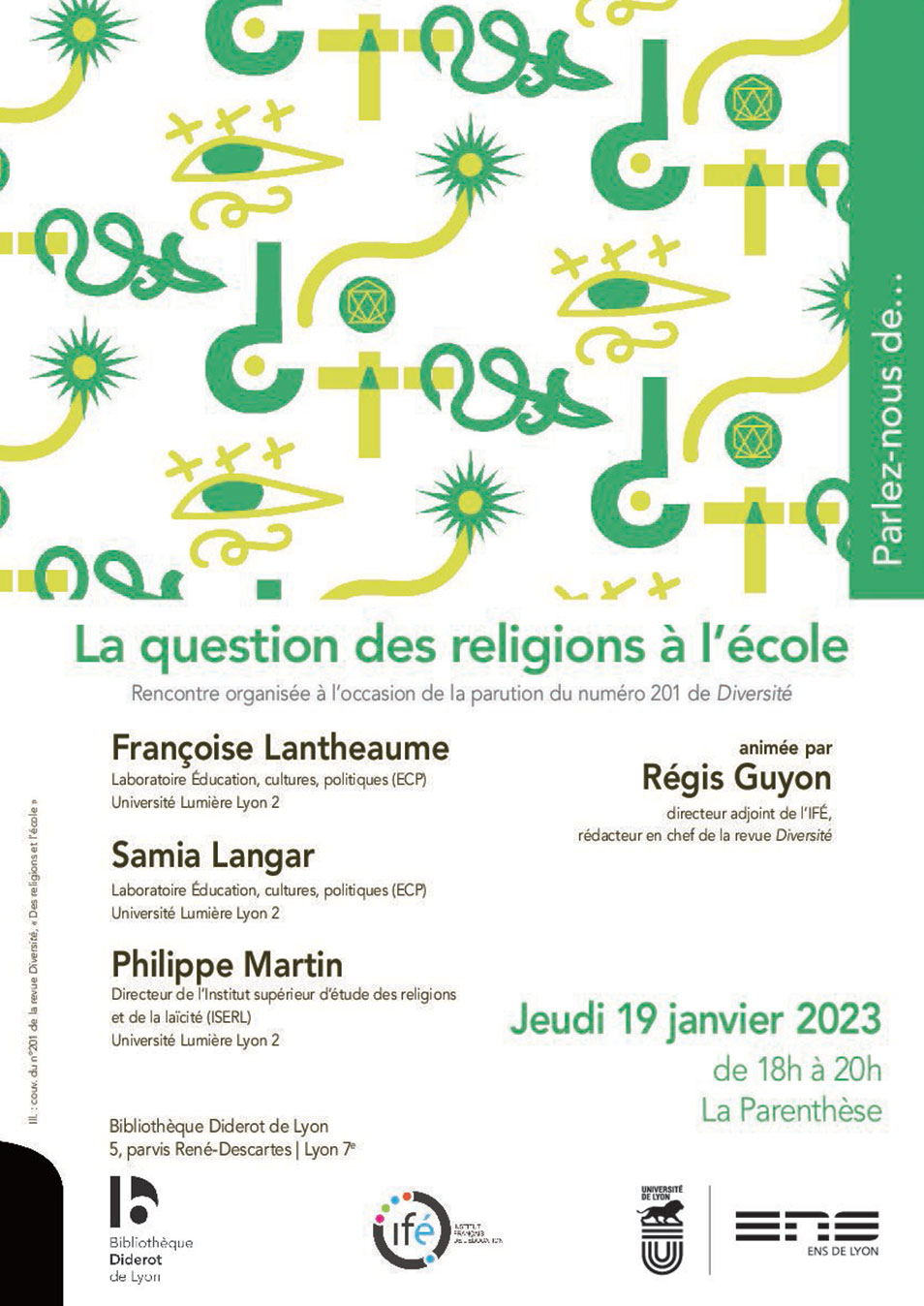 Rencontre organisée par Régis Guyon, directeur adjoint de l'Institut français de l'Éducation (IFÉ) et rédacteur en chef de la revue Diversité, à l'occasion de la parution du numéro 201, « Des religions et l'école ».