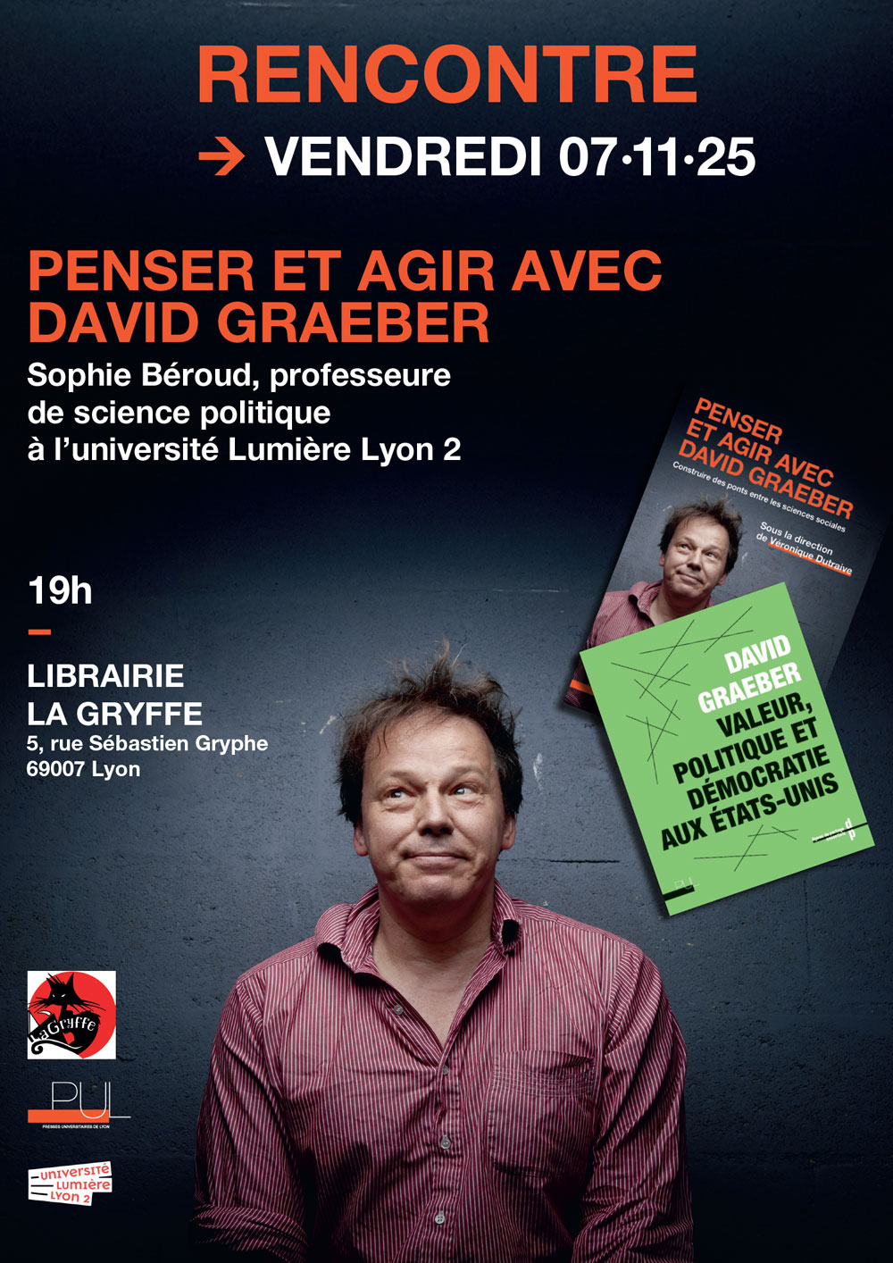 Les Presses universitaires de Lyon vous invitent à une rencontre avec Sophie Béroud, professeure de science politique à l’Université Lumière Lyon 2 et directrice adjointe du laboratoire Triangle, autour de l'ouvrage Penser et agir avec David Graeber, paru aux PUL fin août 2025.