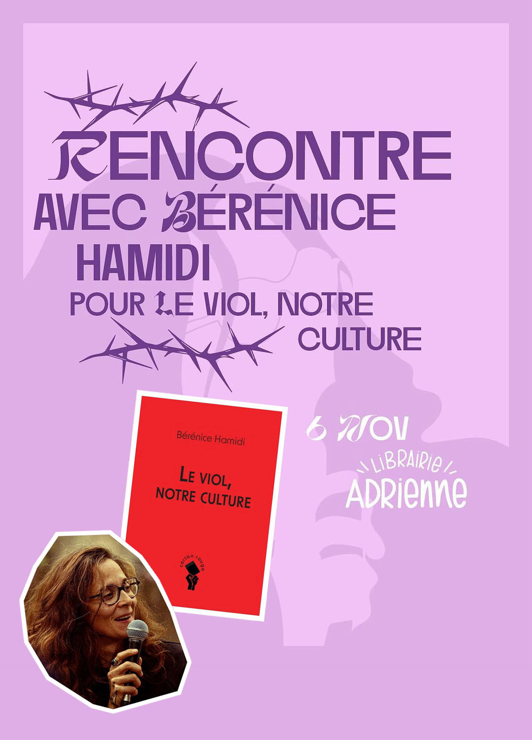 La chercheuse et autrice Bérénice Hamidi est invitée par la librairie Adrienne (Lyon 2e) à l'occasion de la sortie de son essai "Le viol, notre culture" paru aux Éditions du Croquant dans leur nouvelle collection Carton rouge, le jeudi 6 novembre 2025. Spécialiste des représentations culturelles, ses recherches croisent analyse esthétique, sociologie et histoire des politiques culturelles dans une perspective intersectionnelle. Comment les oeuvres reproduisent/transforment-elles les rapports de domination ?