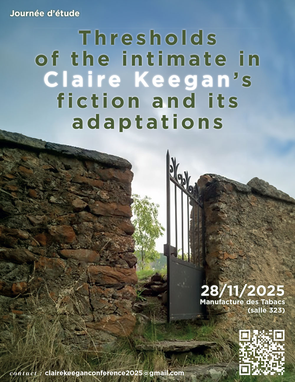 Panel 2 – Adapting, translating, transmitting (modération: Marie Mianowski)♦ 13h30-14h05 – Intervention de Jacqueline Odin (traductrice de C. Keegan vers le français)♦ 14h05-14h40 – Ludivine Bouton-Kelly (Univ. d’Angers): “Language as a ‘translational’ threshold in Foster and Small Things Like These, their translations into French and their cinematographic adaptations” ♦ 14h40-15h05 – Marine Berthiot, Univ. Lyon 2: “Magdalene Drama in and Beyond Ireland: A Comparative Study of Small Things Like These, directed by Tim Mielants (2024), and Piece of My Heart, by Fiona Samuel (2009)” |