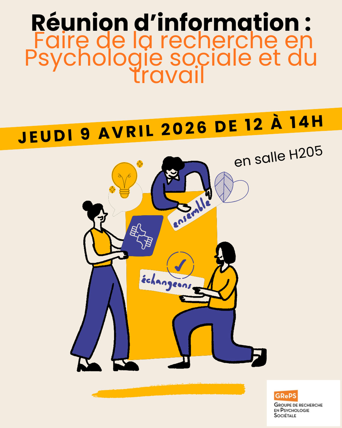 Le Groupe de recherche en psychologie sociétale (GRePS) organise un temps d'informations et d'échanges autour de la recherche en psychologie sociale et du travail.