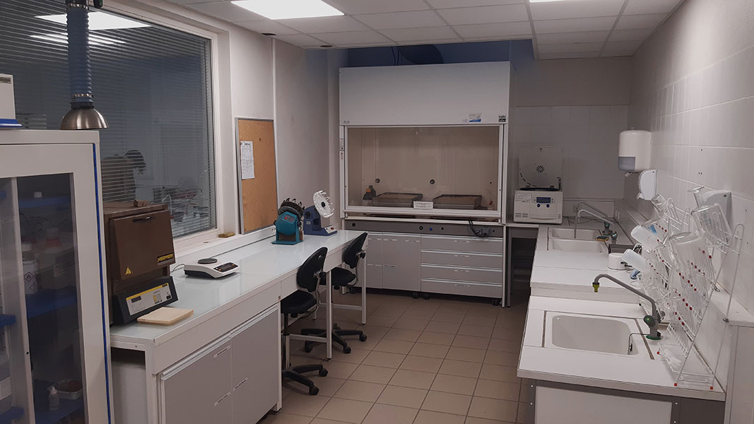 ► Un premier laboratoire vise à réceptionner et décrire les échantillons d’eau ou de sédiments collectés sur le terrain. Il est équipé de balances de précision, d’étuves, d’un broyeur automatique ainsi que d’une chambre froide dans laquelle sont stockés les carottes sédimentaires ainsi que les matériaux environnementaux ou archéologiques nécessitant une conservation dans des conditions thermiques et hygrométriques contrôlées. Une station d’imprégnation et de litholamélage, permettant de produire des lames minces à partir de matériaux meubles (carottes sédimentaires ou prélèvements de sols) est également disponible. Une annexe à ce laboratoire accueille le matériel nécessaire au broyage des échantillons de roches et au tri magnétique des minéraux.