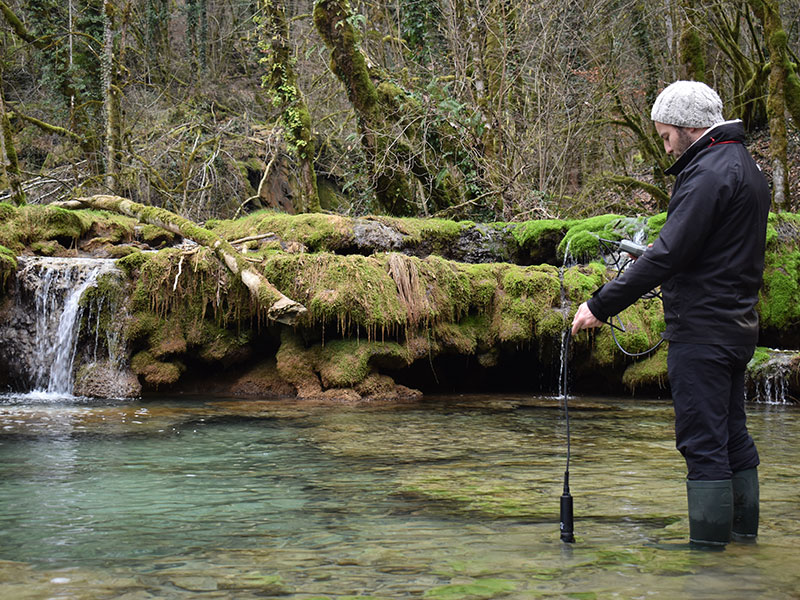 Relevés physico-chimiques en rivière, Les planches près d'Arbois, Jura / Crédit Romain Delunel