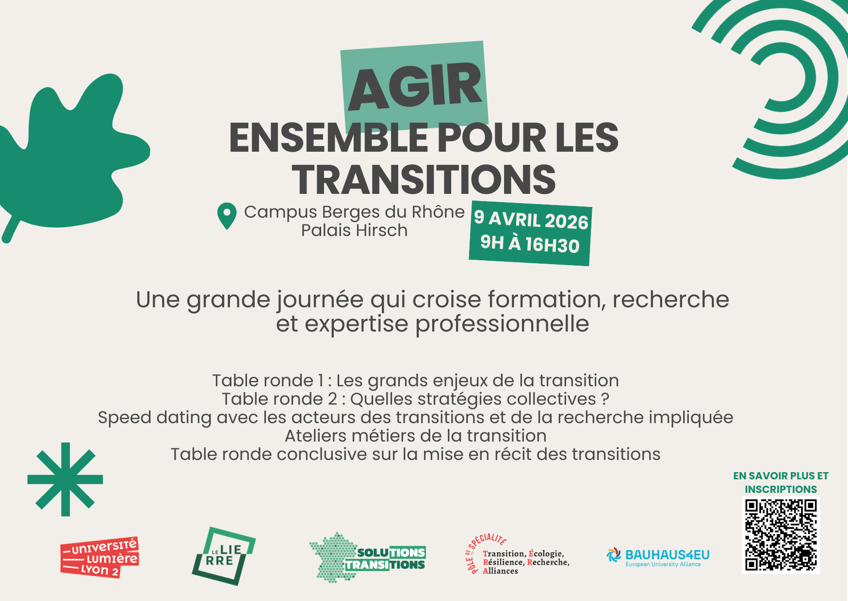 Le jeudi 9 Avril, l'Université Lumière Lyon 2 et son Pôle TERRA organisent, avec le Lierre, réseau écologiste des professionnelles et professionnels de l'action publique et Solutions Transitions, une grande journée de discussion autour des grands enjeux de la transition, offrant un regard croisé entre formation, recherche et l'expertise professionnelle. Ouvert à toutes et tous !