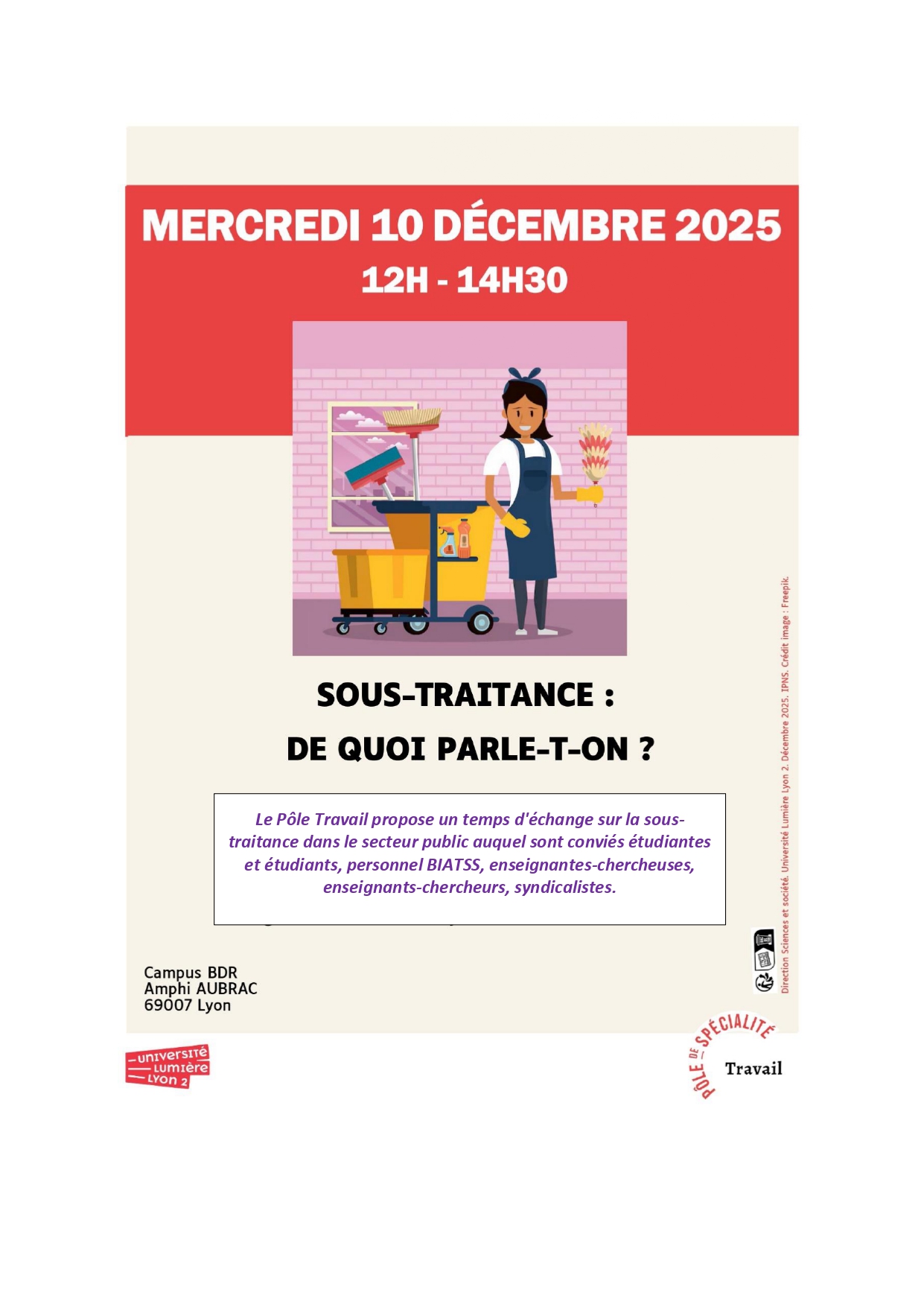 Le Pôle Travail propose un temps d'échange sur la sous-traitance dans le secteur public auquel sont conviés étudiantes et étudiants, personnel BIATSS, enseignantes-chercheuses, enseignants-chercheurs, syndicalistes.