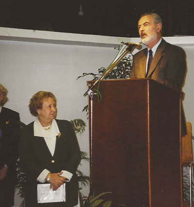 Remise de décoration pour le départ en retraite d'Hélène Reboul par Maurice Bernadet, Président de l'Université Lumière Lyon 2 de 1974 à 1979 - Décembre 1999, Campus Porte des Alpes.