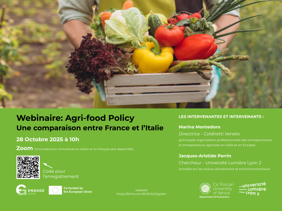Le webinaire sur les défis auxquels l'agroalimentaire est confronté au niveau local en Italie et en France se déroulera par visioconférence le mardi 28 octobre de 10h à 11h. Il est co-organisé par l'université Ca' Foscari de Venise et l'université Lumière Lyon 2, dans le cadre du projet Erasmus+ ENGAGEgreen. »