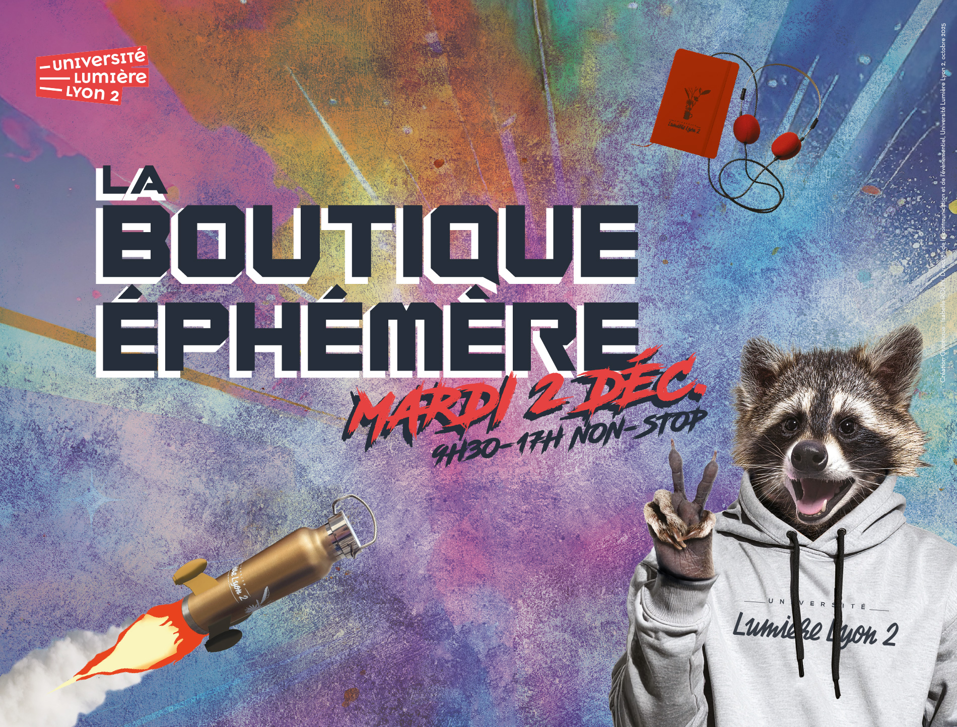 La boutique éphémère de l’Université Lumière Lyon 2 fait son grand retour le mardi 2 décembre 2025, de 9 h 30 à 17 h, en simultané sur nos deux principaux campus :
