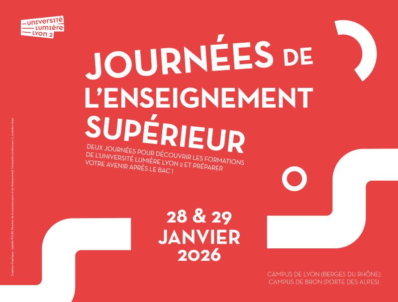 Vous êtes lycéenne ou lycéen et vous souhaitez découvrir les formations post-bac de l’Université Lumière Lyon 2 ? Nous vous proposons de participer aux Journées de l’Enseignement Supérieur, les 28 et 29 janvier 2026.