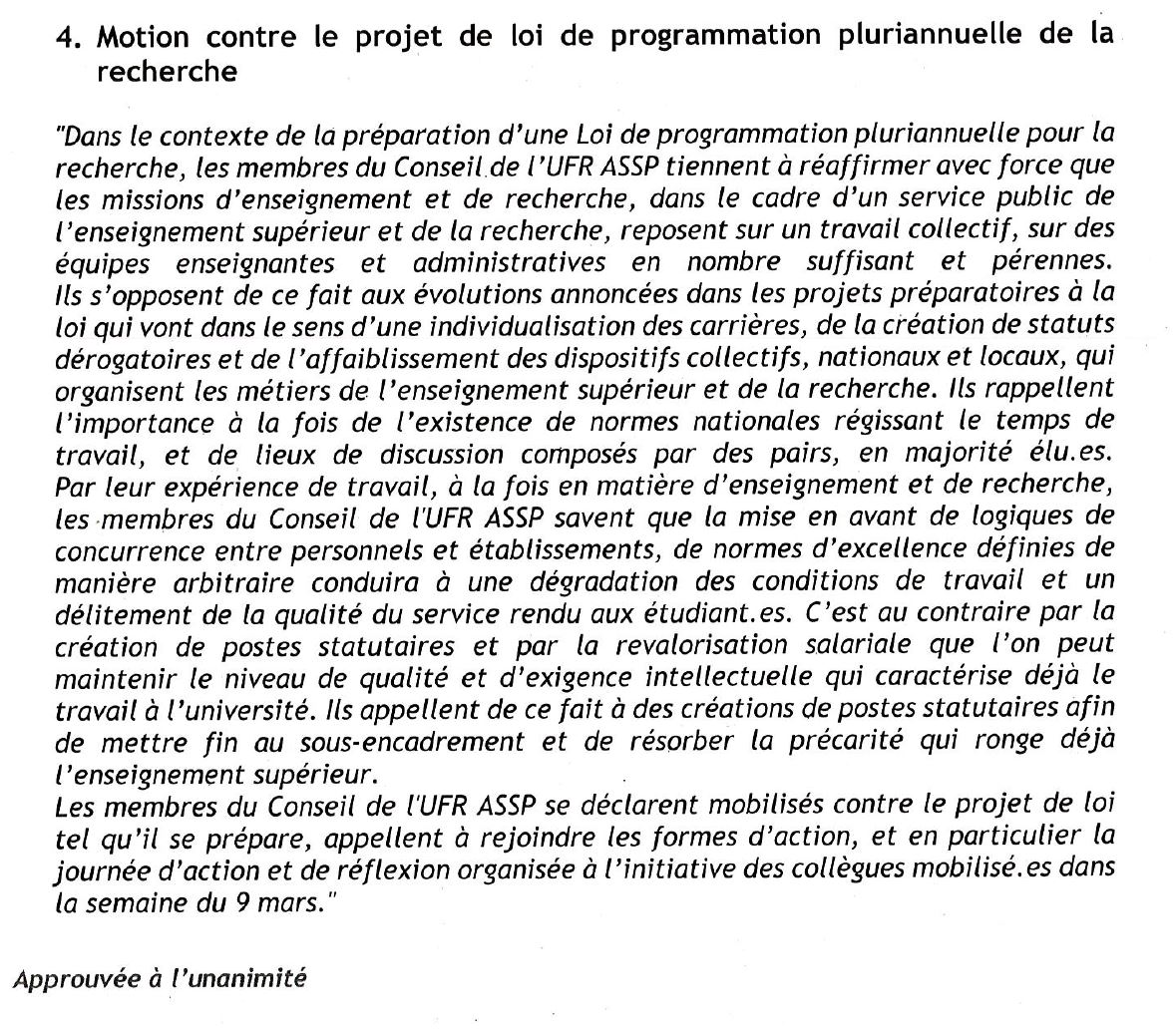 | | Motions des instances de l’Université votées en janvier 2020 sur le projet de LPPR La motion suivante a été adoptée à l’unanimité par le Conseil académique de notre établissement du 27 janvier 2020, à propos de la loi de programmation pluriannuelle de la recherche (LPPR) actuellement en préparation. Une motion identique a été adoptée par la Commission recherche lors de sa séance du 20 janvier (unanimité moins une abstention), par le Conseil des directeur/trices de composantes le 21 janvier (unanimité des présent.es) et par le Conseil d’administration le 24 janvier (unanimité). |