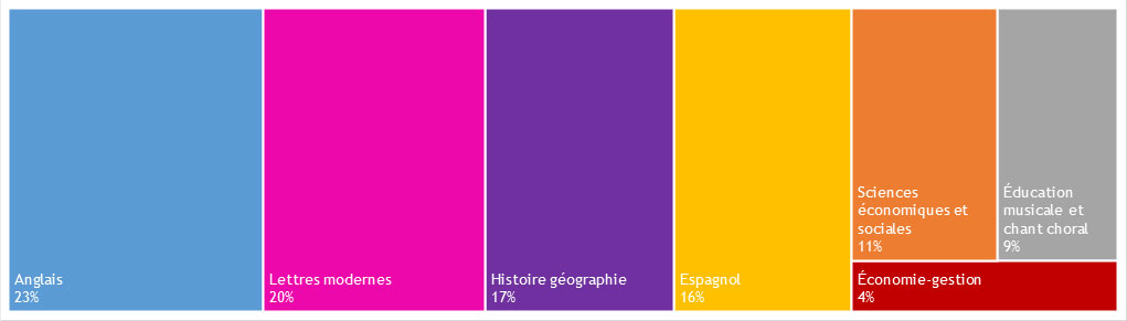 Notez que le pourcentage correspond à l'effectif (part des diplômé.es de cette discipline par rapport à l'ensemble des MEEF 2d degré) et non au taux de réussite par discipline.>> zoom