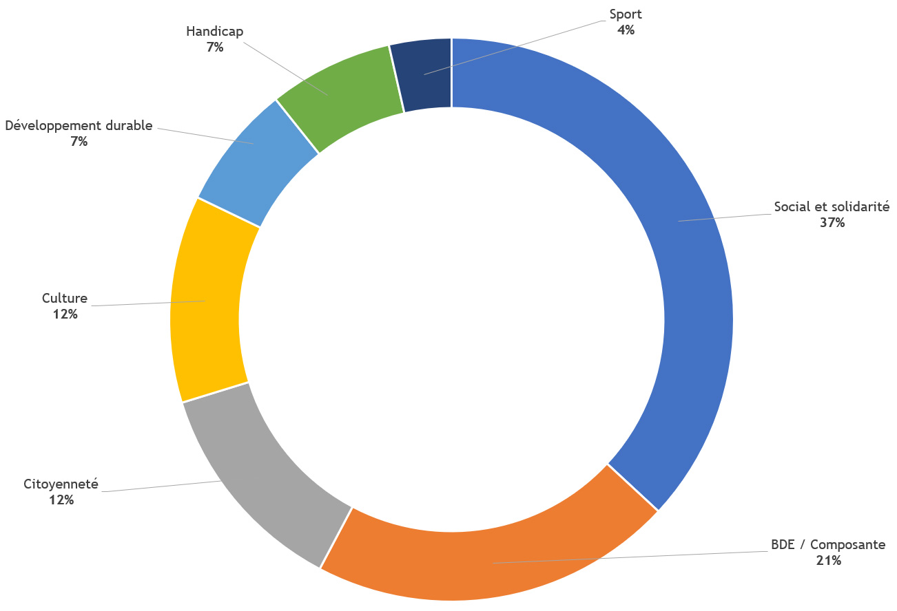 L'engagement des étudiantes et étudiants ayant candidaté au dispositif relève principalement du social et de la solidarité (37%), puis d'un investissement au sein du bureau des élèves ou de l'association de leur composante de formation (21%).