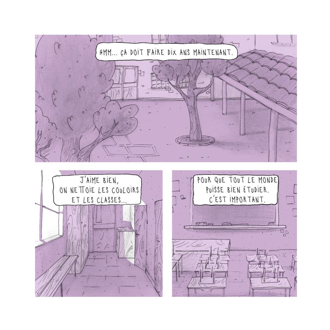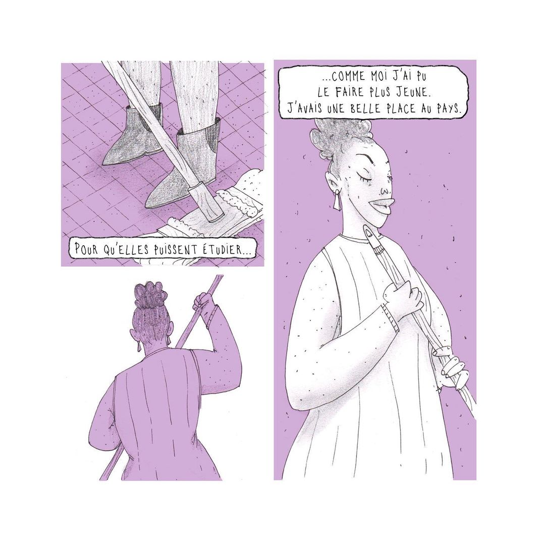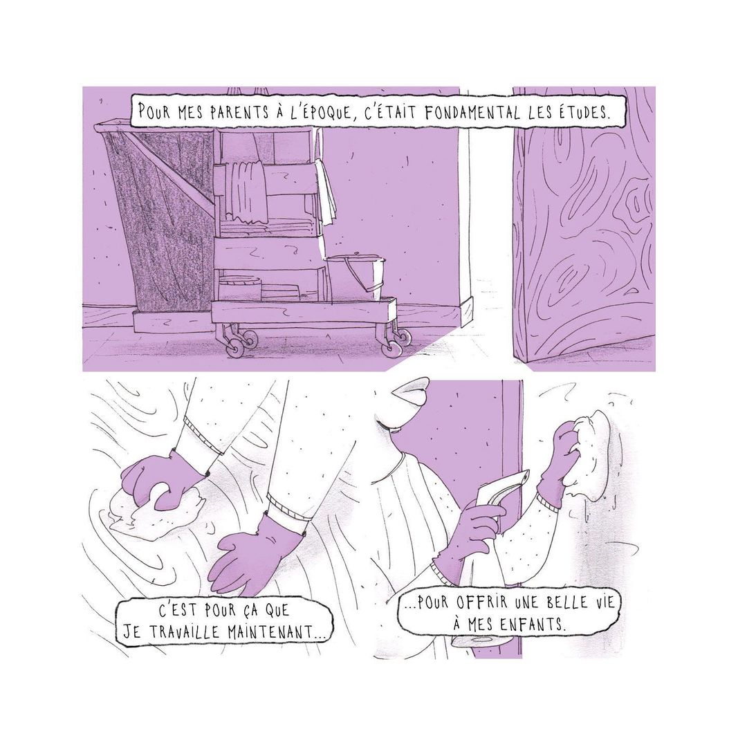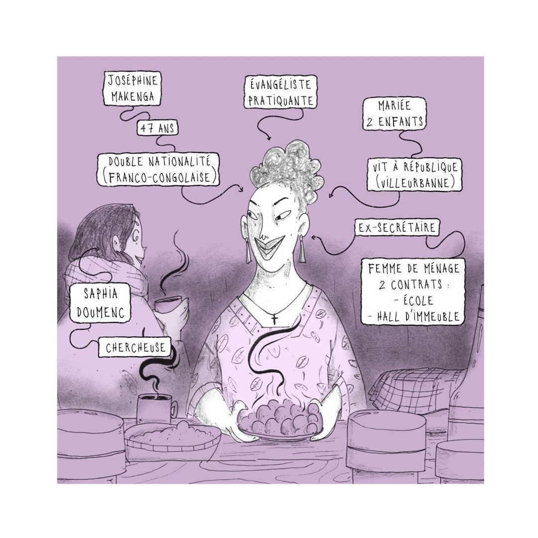 Dans le cadre d'une résidence au Rize, de jeunes chercheures et illustratrices ont été mises en relation le temps d’une expérience graphique de recherche-création, dont l’aboutissement est la publication de deux bandes dessinées engagées et une exposition au Rize de février à avril 2021. Saphia Doumenc a ainsi formé un binôme avec Amélie Bridel. Ce projet a soulevé des enjeux de traduction sensible et plastique de sujets de recherche scientifique et de leur accessibilité au plus grand nombre. Sous traitées, récits de femmes de ménage syndiquées est la bande dessinée proposée par Amélie Bridel à partir de la thèse de Saphia Doumenc.Extrait de "Sous-traitées"