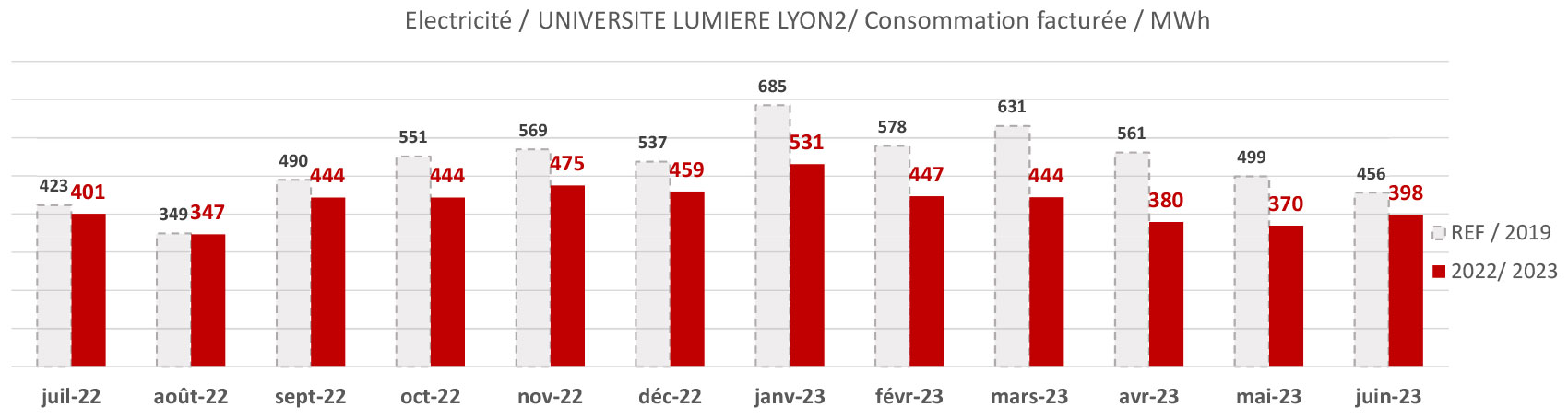 Par rapport à l'année 2019, la baisse observée est de 31% (électricité, gaz et chauffage urbain), mais les coûts ont augmenté de 42%. Pour rappel, la saison de chauffe l'année dernière a été réduite de près d'un mois par rapport à 2019, et les températures abaissées de 1 degré (°C).