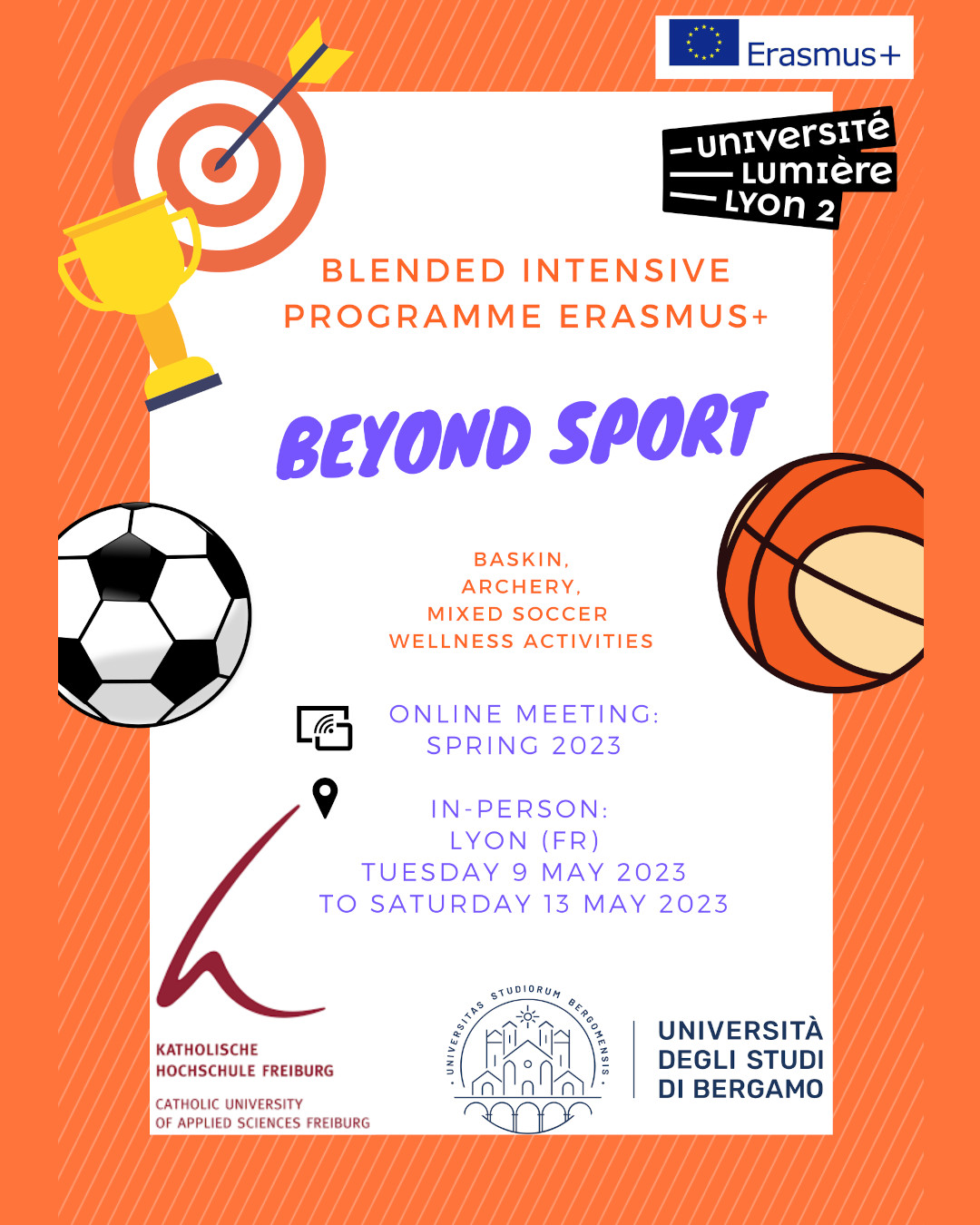 Le programme consistera à suivre quelques cours en ligne dans la première partie du second semestre et une semaine intensive de pratique sportive (Baskin, tir à l’arc, foot mixte, bien-être) du mardi 9 mai au samedi 13 mai 2023 qui se tiendra en présentiel à Lyon avec la participation de professeur.es et d'étudiant.es de l’Università degli Studi di Bergamo (Italie) et de la Katholische Hochschule Freiburg (Allemagne).