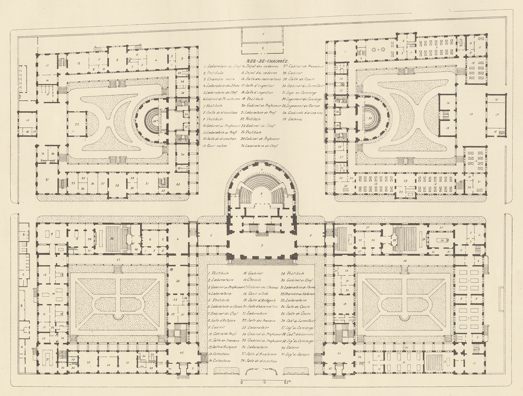 Plan du rez-de-chaussée de la faculté des Sciences et de Médecine. Abraham Hirsch, 1890 - Archives municipales de Lyon, 3 S ATLAS 38 (→ zoomer)