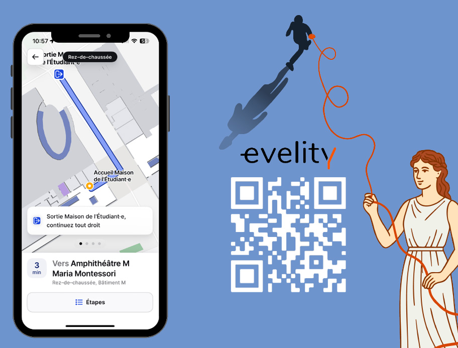 Pensée pour répondre aux besoins des personnes en situation de handicap, Evelity s’avère également très utile pour toutes celles et tous ceux qui souhaitent se repérer rapidement : trouver une salle de cours ou un amphithéâtre, se rendre à un service administratif, ou rejoindre un bâtiment moins connu lors d’un examen.