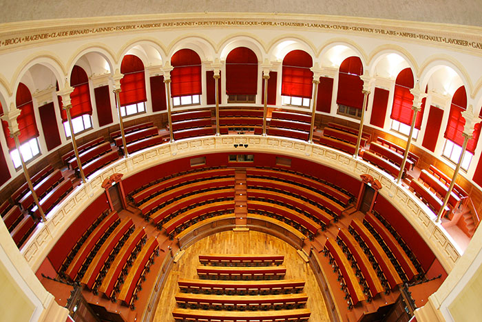 Son cadre prestigieux, face à la cour d'honneur et sous le dôme central, se complète d'ornementations symboliques tels que les palmes, le laurier, le flambeau, les têtes de lion ainsi que les armes de la Ville de Lyon. L'espace autour de l'hémicycle est ponctué par de fines colonnes ioniques élancées. La présence de 21 noms de savants rappellent, comme pour la symbolique des médaillons extérieurs de la cour d'honneur, la vocation première du lieu : les sciences. Nous pouvons lire, entre autre les noms de Bichat, Bernard, Laennec, Paré, Ampère, Gay-Lussac, Lavoisier...