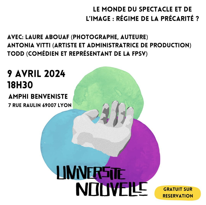 Entrée gratuite sur réservation via ce lien : https://www.helloasso.com/associations/universite-nouvelle/evenements/le-monde-du-spectacle-et-de-l-image-regime-de-la-precarite